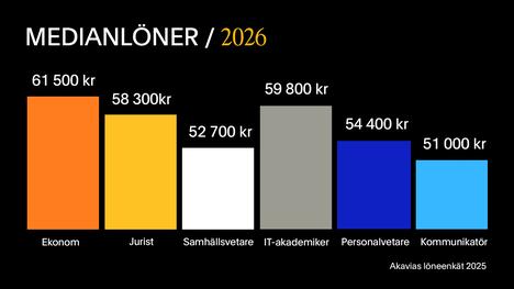 Nu publicerar Akavia lönestatistik för det nya året, baserad på svar från 45.000 akademiker från förbundets sex utbildningsinriktningar: ekonomi, juridik, samhällsvetenskap, personalvetenskap, it och kommunikation. Statistiken visar att ekonomerna fortsatt har högst medianlön följt av it-akademikerna medan juristerna är den profession som ökade mest i lön jämfört med året innan (5,1 procent). Medianlönen för Akavias medlemmar är 58.000 kronor per månad, vilket är 4,5 procent mer än året innan.
